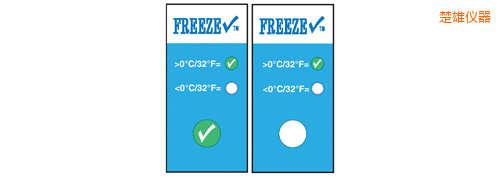TempDot FreezeCheck標(biāo)簽,,型號54000,,用來表示溫度低于0°C。如果溫度低于0°C,,標(biāo)簽不可逆轉(zhuǎn)地發(fā)生變化,,變成白色,,勾形標(biāo)記消失。 冷凍檢查標(biāo)簽用來指示溫度低于0°C. 當(dāng)溫度下降到低于臨界點, 指示劑不可逆轉(zhuǎn)的改變從清晰到白色并且綠色合格標(biāo)志不再顯示。