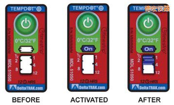 TempDot™Plus標簽應(yīng)存儲在室溫下,并必須在反應(yīng)溫度閾值以上被激活。激活是通過用手指推壓。"On"字出現(xiàn)在第一個窗口中顯示激活。之后5分 鐘內(nèi),,在反應(yīng)溫度或低于反應(yīng)溫度的情況下將標簽貼到產(chǎn)品上。藍色染料熔化并以控制的速率遷移,經(jīng)過白色大窗口。這表示暴露在溫度閾值以上的累計時間。當(dāng)溫 度低于閾值時,該染料固化并停止移動。如果溫度超過閾值,,TempDot®Plus標簽提供即時的視覺跡象。