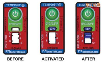 TempDot™Plus標簽應存儲在室溫下,并必須在反應溫度閾值以上被激活。激活是通過用手指推壓。"On"字出現(xiàn)在第一個窗口中顯示激活。之后5分 鐘內,,在反應溫度或低于反應溫度的情況下將標簽貼到產(chǎn)品上。藍色染料熔化并以控制的速率遷移,,經(jīng)過白色大窗口。這表示暴露在溫度閾值以上的累計時間。當溫 度低于閾值時,該染料固化并停止移動。如果溫度超過閾值,,TempDot®Plus標簽提供即時的視覺跡象。