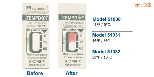 DeltaTrak提供滿(mǎn)足你各種需要的標(biāo)簽:WarmMark溫度標(biāo)簽、高溫?zé)針?biāo)簽和TempDot時(shí)間溫度指示標(biāo)簽顯示溫度變 化超過(guò)預(yù)設(shè)的時(shí)間。FreezeCheck和ColdMark溫度標(biāo)簽用于顯示運(yùn)輸溫度低于0℃。商業(yè)洗碗機(jī)使用的TempDot高溫?zé)針?biāo)簽可顯示最終沖 洗水溫是否達(dá)到71℃(HACCP體系所要求的溫度)。 TempDot時(shí)間溫度標(biāo)簽,,型號(hào)51030-51032,,是一種低成本的標(biāo)簽,,可顯示溫度高于閾值長(zhǎng)達(dá)60分鐘。當(dāng)溫度超過(guò)臨界值,,標(biāo)簽顏色變化開(kāi)始,,但溫度下降到閾值之下時(shí),,標(biāo)簽顏色變化停止,,如此來(lái)顯示累積溫度超過(guò)的時(shí)間-,,對(duì)于許多質(zhì)保應(yīng)用來(lái)說(shuō),,度分鐘是非常的重要的概念。有三種溫度閾值5℃、8℃和10℃可供選擇。 這個(gè)低成本標(biāo)簽可以指示一段長(zhǎng)到60分鐘暴露在臨界點(diǎn)溫度。