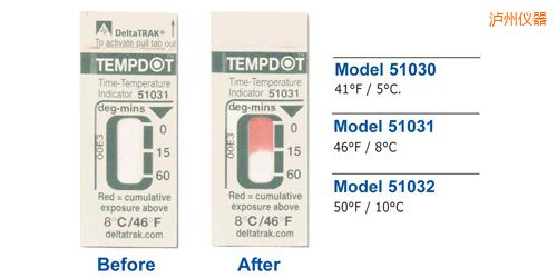 DeltaTrak提供滿足你各種需要的標(biāo)簽:WarmMark溫度標(biāo)簽、高溫?zé)針?biāo)簽和TempDot時(shí)間溫度指示標(biāo)簽顯示溫度變 化超過(guò)預(yù)設(shè)的時(shí)間。FreezeCheck和ColdMark溫度標(biāo)簽用于顯示運(yùn)輸溫度低于0℃。商業(yè)洗碗機(jī)使用的TempDot高溫?zé)針?biāo)簽可顯示最終沖 洗水溫是否達(dá)到71℃(HACCP體系所要求的溫度)。 TempDot時(shí)間溫度標(biāo)簽,,型號(hào)51030-51032,,是一種低成本的標(biāo)簽,,可顯示溫度高于閾值長(zhǎng)達(dá)60分鐘。當(dāng)溫度超過(guò)臨界值,,標(biāo)簽顏色變化開始,,但溫度下降到閾值之下時(shí),,標(biāo)簽顏色變化停止,,如此來(lái)顯示累積溫度超過(guò)的時(shí)間-,,對(duì)于許多質(zhì)保應(yīng)用來(lái)說(shuō),,度分鐘是非常的重要的概念。有三種溫度閾值5℃、8℃和10℃可供選擇。 這個(gè)低成本標(biāo)簽可以指示一段長(zhǎng)到60分鐘暴露在臨界點(diǎn)溫度。