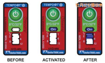 TempDot™Plus標(biāo)簽應(yīng)存儲在室溫下,,并必須在反應(yīng)溫度閾值以上被激活。激活是通過用手指推壓。"On"字出現(xiàn)在第一個窗口中顯示激活。之后5分 鐘內(nèi),在反應(yīng)溫度或低于反應(yīng)溫度的情況下將標(biāo)簽貼到產(chǎn)品上。藍(lán)色染料熔化并以控制的速率遷移,經(jīng)過白色大窗口。這表示暴露在溫度閾值以上的累計時間。當(dāng)溫 度低于閾值時,,該染料固化并停止移動。如果溫度超過閾值,TempDot®Plus標(biāo)簽提供即時的視覺跡象。