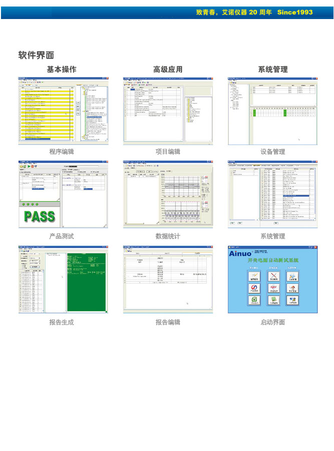 主要特點 AN8060自動測試系統(tǒng)軟件運行于Windows 2000/Xp/Vista等操作系統(tǒng)環(huán)境下,具有以下鮮明的特點: 1. 開放式軟件平臺,硬件驅(qū)動庫采用動態(tài)鏈接的方式與主程序獨立; 2. 支持任意增加基于GPIB總線或者RS232/RS485總線的設(shè)備; 3. 可擴展其他硬件設(shè)備,,如條碼掃描器、打印機等; 4. 內(nèi)置各型號標準測試項目庫,,便于客戶快速使用; 5. 用戶可編輯測試程序; 6. 用戶可編輯測試項目; 7. 用戶可編輯報表格式; 8. 高度加密的用戶權(quán)限控制、發(fā)布管理; 9. 專業(yè)SPC報表功能; 10. 測試結(jié)果動態(tài)存儲、記錄; 11. 支持主/從控制模式; 12. 具有遠程網(wǎng)絡(luò)控制功能; 13. 獨創(chuàng)并行軟件架構(gòu),,支持測試命令并發(fā),,提高測試速度; 14. 中英文雙語切換,易學(xué)易用;
