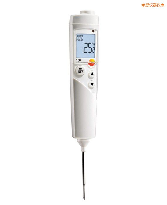 testo 106 具有響應(yīng)快、精度高的特點(diǎn)。適用于食品生產(chǎn)車間、餐飲、酒店、工業(yè)廚房、超級(jí)市場(chǎng)等的快速測(cè)量。該款溫度儀外形小巧、經(jīng)濟(jì)實(shí)用。配備的探頭極細(xì)而堅(jiān)固,非常適合測(cè)量小尺寸食品的中心溫度。