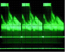圖2是無Z軸亮度調制較老數(shù)字示波器的顯示。雖然該示波器甚至在5ms/div時仍有捕獲信號細節(jié)的足夠采樣率和存儲器深度但所有捕獲點的顯示亮度相同。這就在視覺上丟失了信號包絡內的波形細節(jié)。因此在選擇模擬示波器技術還是選擇較老的數(shù)字顯示技術上不應對今天視頻實驗室中充斥模擬示波器感到驚奇!