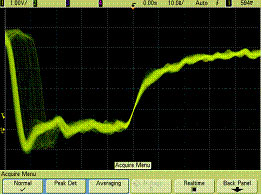 圖9是在模擬示波器上顯示的同樣信號。我們在這里不能示出抖動沿因為它產(chǎn)生在觸發(fā)參考點(上升沿)之前。但能觀察到信號沿有時產(chǎn)生間歇毛刺。我們不能用模擬示波器觀察毛刺因為對常規(guī)模擬示波器顯示而言它出現(xiàn)次數(shù)太少即使把顯示亮度調到最亮。