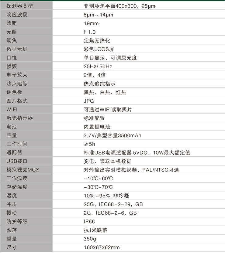 產(chǎn)品特點 可拍照,法國紅外熱像儀,并通過WIFI分享所拍攝照片,熱像儀,方便多人同時瀏覽 直觀的按鍵功能操作,防爆紅外熱像儀,無需培訓,紅外熱像儀 報價,符合人體工學設計,長期使用依 舊舒適 超靜音和防漏光設計,國產(chǎn)紅外熱像儀,使用時不暴露自身 內(nèi)置式鋰電池,5小時超長電池使用時間,并可外接便攜電源持續(xù)使用 標準Micro USB充電接口,新一代紅外熱像儀,適應多種充電方式(適配器/車載點煙器/電腦/充 電寶) 激光指示器可用于目標指示 IP66超強防護等級,抗1米跌落,適應野外使用環(huán)境